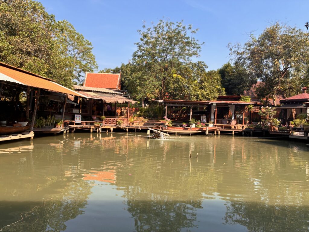 After Apple Maps confidently delivered us to a tiny village nowhere near Ayutthaya, we switched to Google Maps, which returned us to civilization. We checked into a neat little hotel property called Ayutthaya Retreat, a cluster of restored monk living quarters on stilts, likely dating back to the 1700s. The rooms were built in the traditional Central Ruan Thai style, with old teak woodwork throughout. Behind the living quarters sat a common area with a restaurant, massage space, pool, and fish pond—a surprisingly great place to socialize and attempt survival in the 108°F heat.
