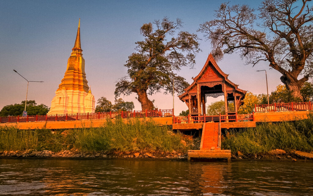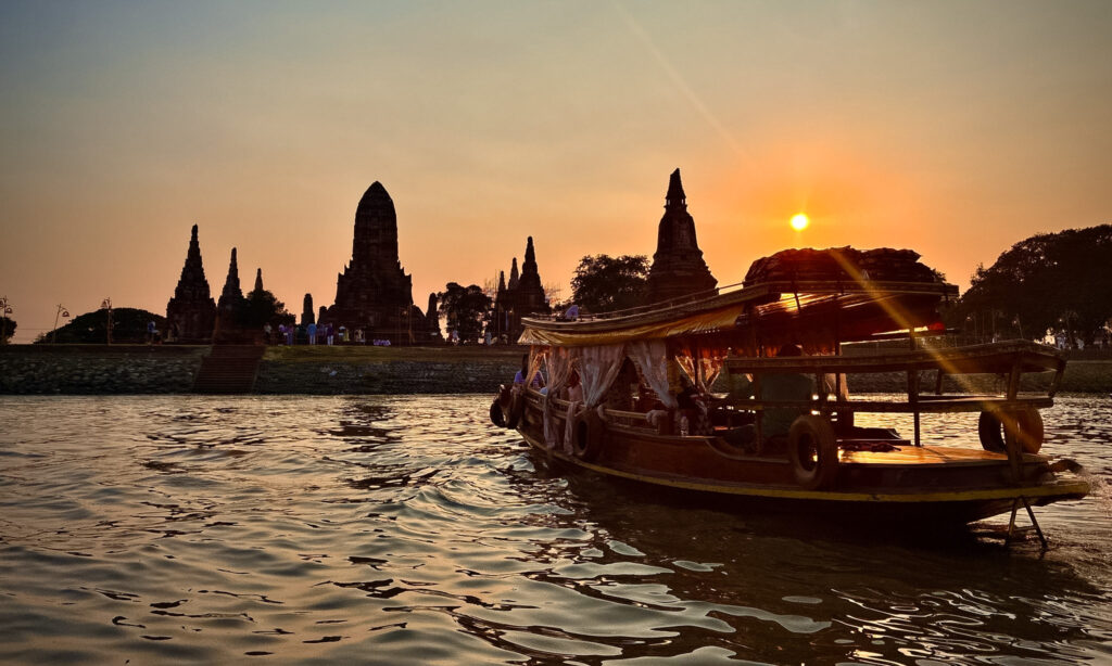 Our captain gave us a peaceful tour of river life around Ayutthaya, with a stop at Wat Chaiwatthanaram. We got out and explored, but even an hour before sunset, the heat was brutal. While Anchalee and I walked around in shorts and light shirts, Thai couples were renting traditional Ayutthaya-era royal clothing for photos. I can’t imagine how they weren’t melting in that afternoon heat.